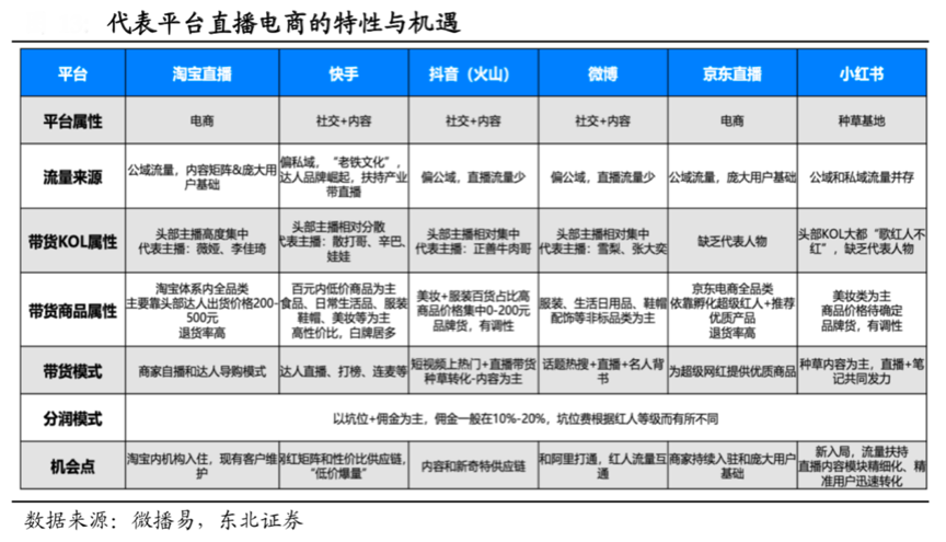 根據(jù)微播易、東北證券等綜合資訊表明,三大類直播電商平臺各有特色,電商平臺(淘寶、拼多多、京東等)、內(nèi)容社交平臺(抖音、快手、微博等)、 種草類平臺(小紅書、B 站)。利益鏈切分較為共性:商家承擔(dān) 5%~10%的平臺抽傭,帶貨主播享有10%+的傭金分成,某些主播還會收取坑位費(即上鏈接的費用)。