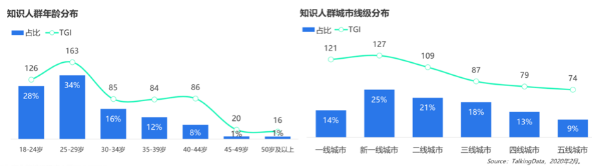 根據TalkingData等綜合資訊顯示,知識人群的年齡比較集中在25~34歲偏年輕類人群,基對于知識教育、技能提升等需求是比較迫切的,一線城市、新一線城市及二線城市等城市人群居多,激烈的市場競爭、升學升職壓力等迫使其更多關注知識更新和技能提升等。