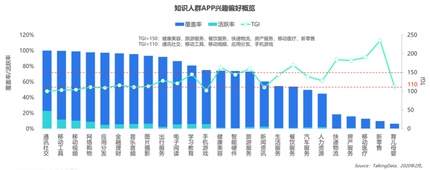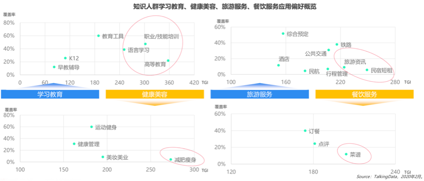 受知識人群歡迎的內容有自己的特色及領域歸屬,構建專業化、高價值的“品牌內容池”就要重點關注這些內容。根據TalkingData等綜合資訊顯示,知識人群追求對高等教育、語言學習、職業/技能培訓類應用有天生的好感,同時注重“個人旅游、身材管理等,運動健身類應用覆蓋率60%以上,這些內容值得各企業重點關注、全面收集及重點分析。