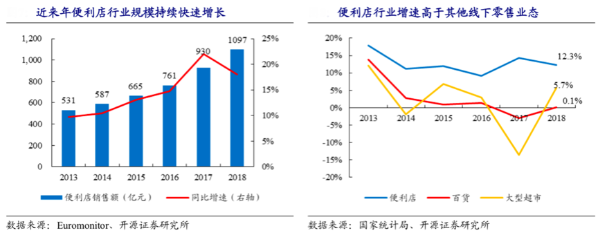 快捷高效的生活推動了“便利消費增長”,激發了社會化服務需求,渠道轉化率進一步提高。根據 Euromonitor 數據顯示,2018年國內便利店行業規模達1097億元,2013-2018年復合增長率達15.6%。由于人口與家庭結構的變化,越來越多的消費需求在貼近居民的中小業態零售模式中得以滿足。同時根據國家統計局數據,2018 年便利店行業增速為 12.3%,連續多年高于百貨(增速 0.1%)與大型超市(增速5.7%)的 行業增速,成為線下零售業中增長最快的細分業態。