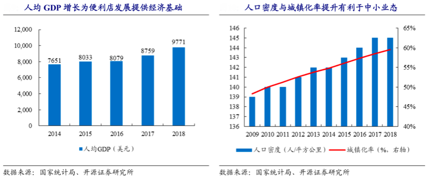 順時而進,憑借人口密度與城鎮化“東風”大力推進,持續點亮零售消費中“人”之商業價值。根據國家統計局、開源證券研究所等綜合資訊表明,2018年中國人均 GDP 超9000美元,居民收入增長驅動行業消費升級,消費者即時性需求的增加將支撐便利店行業高速增長。2018 年,中國人口密度達到 145 人/平方公里并保持增長態勢,國內城市人口密度已達到 2546 人/平方公里。