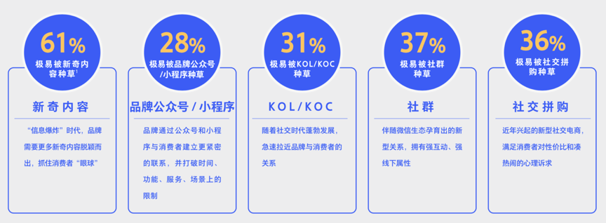 據騰訊、BCG《2020中國社交零售白皮書》調查數據表明,社交新零售有五大觸點,其中61%的用戶會極容易被新奇內容所吸引,28%的用戶會被品牌公眾號/小程序的文章種草,31%的用戶極容易被KOL/KOC所種草,37%的用戶會被社群所種草,而36%的用戶會被社交拼購活動所影響。