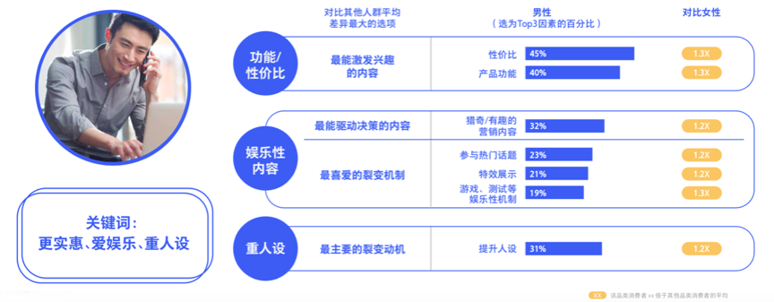 據(jù)騰訊、BCG《2020中國(guó)社交零售白皮書(shū)》調(diào)查數(shù)據(jù)表明,男性對(duì)性價(jià)比和產(chǎn)品功能更感興趣,其決策與裂變時(shí)對(duì)娛樂(lè)性內(nèi)容的偏好更強(qiáng),同時(shí)比較注重人設(shè),會(huì)更謹(jǐn)慎產(chǎn)品文章內(nèi)容是否真實(shí)而決定是否裂變。