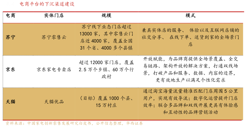 2019 年,四線及以下城市家電消費(fèi)增長(zhǎng)特征最為明顯,家電銷(xiāo)量同比增 長(zhǎng) 42.4%,銷(xiāo)售額同比增長(zhǎng) 7.2%,四線及以下城市家電銷(xiāo)售 額占比較 2018 年上升 1.1 個(gè)百分點(diǎn),下沉市場(chǎng)家電消費(fèi)顯著增長(zhǎng)。據(jù)中國(guó)家電創(chuàng)新零售發(fā)展研究白皮書(shū)、公開(kāi)信息整理及華西證券等綜合資訊表明,各大電商平臺(tái)正在加速推進(jìn)“電商平臺(tái)的政黨渠道建設(shè)”,蘇寧依托“蘇寧零售云”、京東做強(qiáng)“京東家電專(zhuān)賣(mài)店”、天貓放大“天貓優(yōu)品”影響力,占據(jù)市場(chǎng)競(jìng)爭(zhēng)優(yōu)勢(shì)。