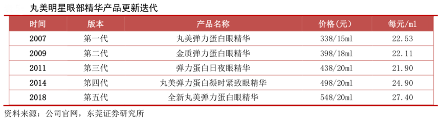 經典案例:根據公司官網、東莞證券研究所等綜合資訊表明,其產品策略主要是針對核心產品進行更新迭代,目前已升級至第五代,第五代彈力蛋白精華素實現收 入 7,278.80 萬元,占丸美品牌眼部護膚類產品收入的13.88%,優秀的產品力創造了獨特的“產品品牌價值”,點燃了產品“高品質護理”的消費價值。