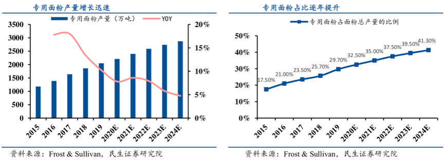 經典表現:根據Frost&Sullivan、民生證券研究院等綜合資訊表明,專用面粉產量增長迅速,而且其占比逐年提升,2015-2019 年我國專用面粉產量增長迅速,CAGR 達 14.9%,明顯高于總體面粉產量(CAGR 0.6%);從占比來看,專用面粉產量占面粉總 產量的比重逐年提升,由 2015 年的 17.9%提升至 2019 年的 29.7%,接近 1/3。