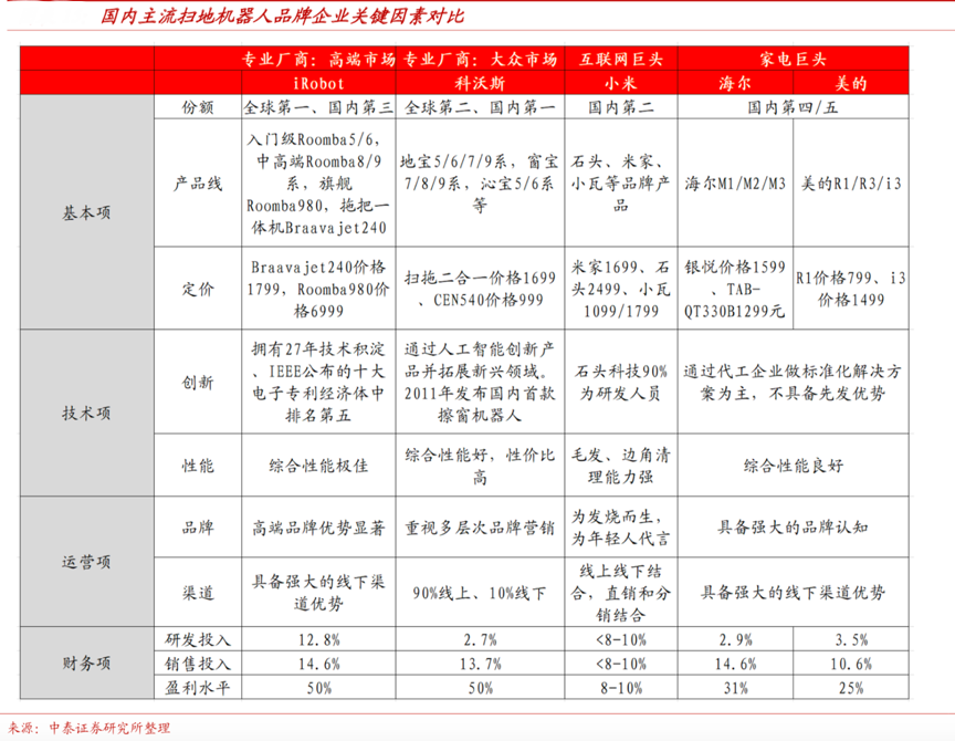 經典案例:根據中泰證券研究所等綜合資訊表明,“掃地機器人”是強技術背書行業,產品對技術的要求比較高,通過國內主流掃地機器人品牌企業關鍵因素對比,我們可以發現,升級趨勢下,IRobot、Dyson 國際巨頭紛紛強勢切入高端市場,品牌的情感化體驗及價值化要求越來越明確,用戶對產品的要求日益提升。