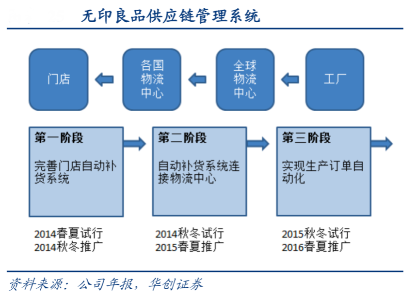 經典案例:根據無印良品官網等綜合資訊表明,其建立“可視化”供應鏈系統,以日本作為全球總部,全球的物流數據都可以被總部追蹤查看,實現對產品標簽、質量、規格的統一管理。