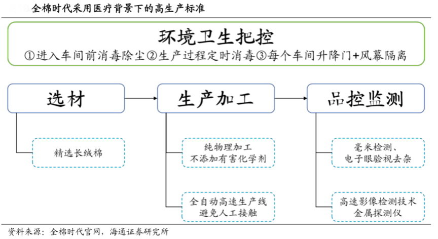 經(jīng)典案例:根據(jù)全棉時代官網(wǎng)、海通證券研究所等綜合資訊表明,“全棉時代”的日用品生產(chǎn)線從原材料的采購到生 產(chǎn)過程控制、質檢出廠,都沿用了穩(wěn)健醫(yī)療的體系。以環(huán)境衛(wèi)生把控為例,鮮明的踐行了這一高生產(chǎn)標準。