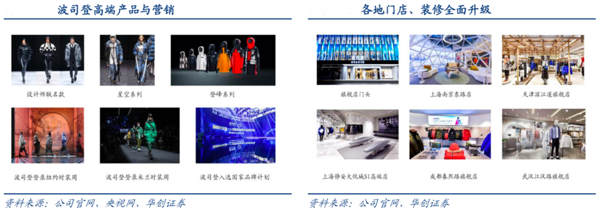 經(jīng)典案例:根據(jù)公司官網(wǎng)、央視網(wǎng)及華創(chuàng)證券等綜合資訊表明,波司登聯(lián)合優(yōu)質(zhì)公司及設(shè)計師資源升級門店形象及店鋪陳列,以“千店換門頭”升級品牌 logo,店內(nèi)裝潢全面升級,紅地毯、視頻宣傳、專賣店統(tǒng)一裝修風(fēng)格、飲水機(jī)、雜志等相關(guān)服務(wù)全面提升品牌化的門店體驗,并于2018 年入選國家品牌計劃。