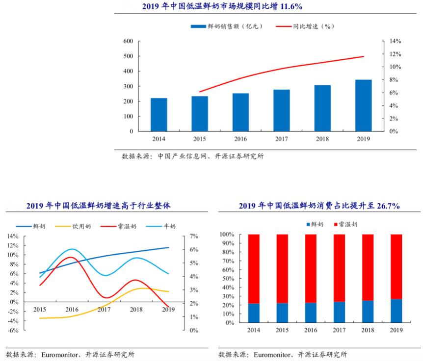 經典案例:根據中國產業信息網、Euromonitor、開源證券研究所等綜合資訊表明,低溫鮮奶市場規模由 2015 年的 234 億元增長至 2019 年的 343 億元,2015-2019 年 CAGR 達 8%。低溫酸奶及低溫鮮奶市場規模增速均高于行業整體增速。根據 Euromonitor等綜合數據顯示,低溫鮮奶占牛奶銷售額比例也快速提升,自 2014 年的 21.6%提升至 2019 年的 26.7%。