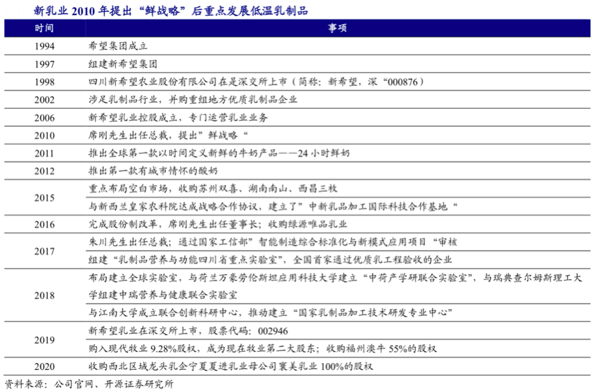 經典案例:根據公司官網、開源證券研究所等綜合資訊表明,新希望乳業控股于 2006 年成立,于2019年上市,主營業務為乳制品及含乳飲料的研發、生產和銷售,并于2010 年公司確定“鮮戰略”作為公司核心戰略,重點布局、著重發展低溫乳制品,構建城市型乳企聯合艦隊,公司業務規模正逐步擴大。