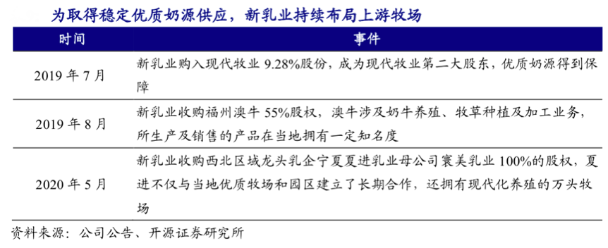 經典案例:根據公司官網、開源證券研究所等綜合資訊表明,自 2019 年上市以來,新希望乳業先后兼并收購了現代牧業、福州澳牛及夏進乳業,并將在甘肅永昌、寧夏海原和四川冕寧投資新建牧場。
