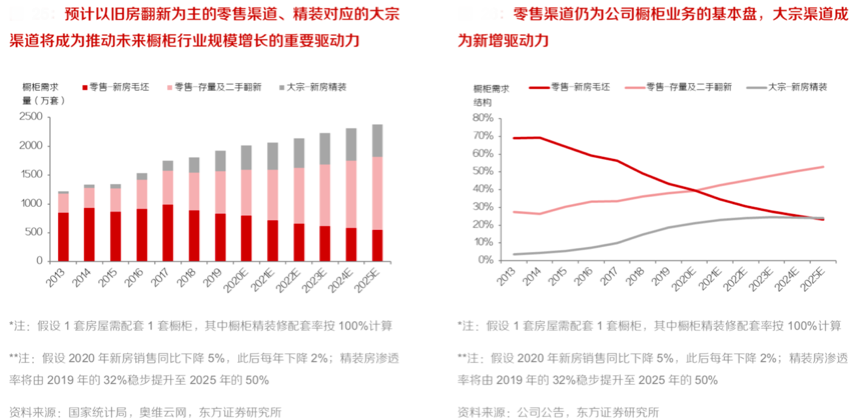 經典案例:根據公司公告、東方證券研究所等綜合資訊表明,零售渠道仍是歐派家居櫥柜業務的基本盤,大宗渠道成為新增驅動力,其預計 2025 年國內櫥柜行業需求結構中,新房毛坯(零售)、存量及二手房翻新(零售)、新房精裝(大宗)對應的需求量占比將分別達 23%、53%、24%。