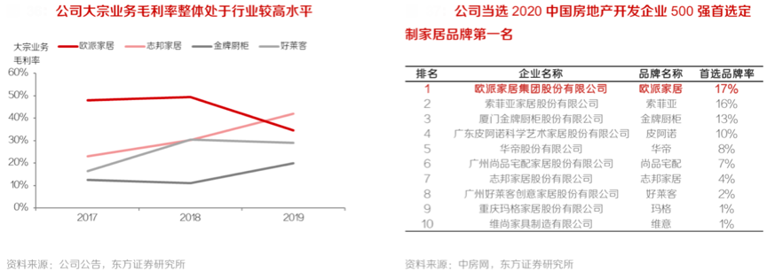 經典案例:根據公司公告、東方證券研究所等綜合資訊表明,歐派家居大宗業務毛利率整體處于行業較高水平,采取直營+工程代理商相結合的方式開展大宗業務,2019 年公司大宗業務毛利率為 34.63%,盈利能力整體優于行業平均水平。同時根據中房網、東方證券研究所等綜合資訊表明,其當選為 2020 中國房地產開發企業 500 強首選定制家居品牌第一名,首選品牌率達17%。