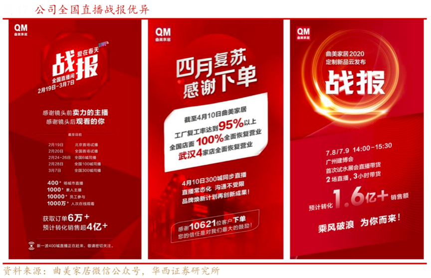 經典案例:根據曲美家居微信公眾號、華西證券研究所等綜合資訊表明,其全國直播戰報優異, 7 月 8 日,公司參加建博會,線上直播發布 2020 年定制新 品,據曲美家居微信公眾號,2 場直播,3 小時帶貨,預計轉化 1.6 億銷售額。