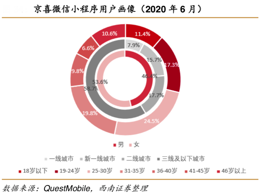 經典案例:根據QuestMobile、西南證券等綜合資訊表明,京喜社交電商玩法持續升級,京喜小程序極大地刺激了 18 歲以下和 45 歲以上用戶的消費需求,活躍用戶增長主要來源于三線以及下城市,占比高達 58.7%,此類用戶收入水平相對較低,閑暇時間相對較多,對商品價格敏感度更高,京喜以高產品性價比吸引了大量此類人群,放大了品牌在低線市場的品牌聲量。