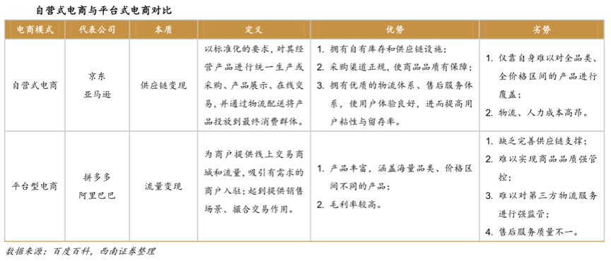 經典案例:根據百度百科、西南證券等綜合資訊表明,自營式電商與平臺式電商有所不同,自營式電商強化供應鏈變現,依托強大的標準化產品采購、物流優勢、服務優勢等放大品牌聲量,而平臺型電商更多依靠大量流量匯聚、豐富產品及高毛利率等進行變現,缺乏完善供應鏈的支撐及物流倉儲服務。兩者的品牌聯想不同,品牌價值迥異。