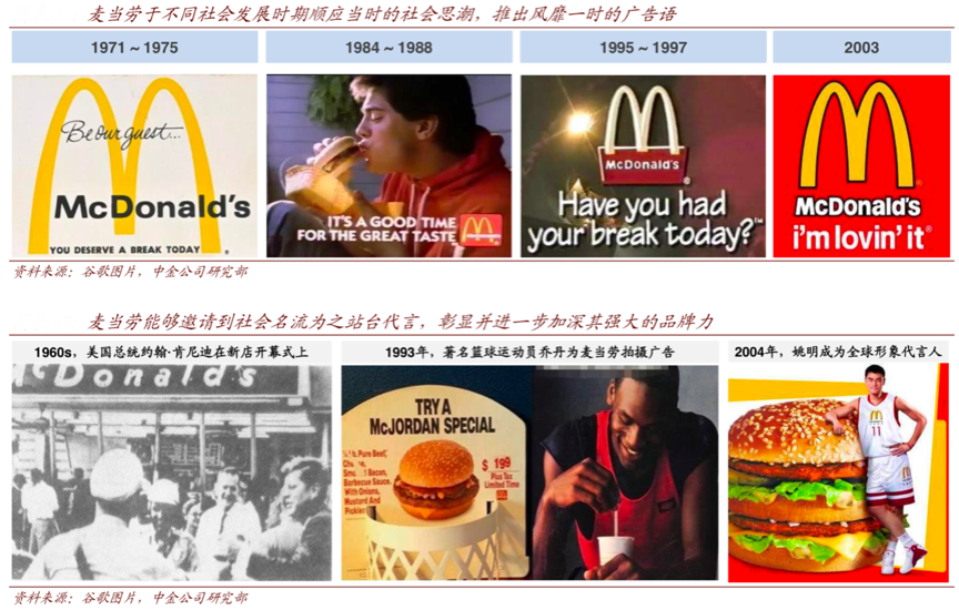 經(jīng)典案例:根據(jù)谷歌圖片、中金公司研究部等綜合資訊表明,麥當(dāng)勞品牌廣告語從 70 年代“今天你該休息了(You deserve a break today)”順應(yīng)強(qiáng)調(diào)勞動回報的社會思潮,80 年代“麥當(dāng)勞和你”體現(xiàn)自我導(dǎo)向,再到 2003 年風(fēng)靡全球的“我就喜歡(i’m lovin’ it)”強(qiáng)調(diào)娛樂價值,塑造“歡樂形象”。其時刻與時俱進(jìn),塑造強(qiáng)聯(lián)想力的品牌宣言。