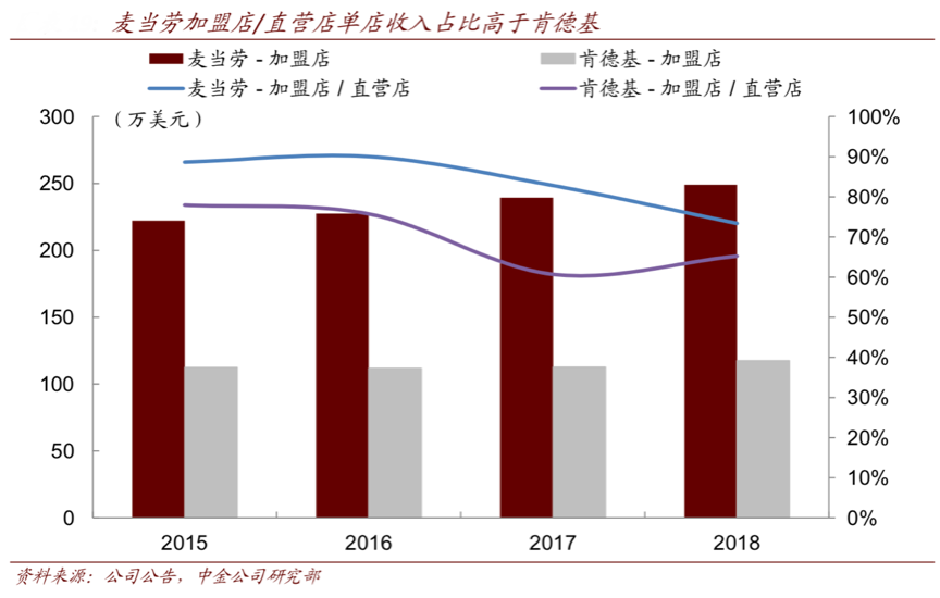經(jīng)典案例:根據(jù)公司公告、中金公司研究部等綜合資訊表明,麥當(dāng)勞自1967年開啟全球擴(kuò)張,先后進(jìn)入巴西、泰國、中國大陸、印度、越南等地,進(jìn)入市場和門店擴(kuò)張的過程也伴隨著當(dāng)?shù)厣鐣挟a(chǎn) 階級的崛起和居民消費(fèi)水平的提升,定義了當(dāng)?shù)鼐用駥τ诿朗娇觳偷恼J(rèn)知。同時2015-2018 年麥當(dāng)勞加盟店單店收入占直營店單店收入比例的均值達(dá) 84%,而同時期肯德基的比例均值為 70%。