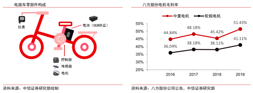 經典案例:根據中信證券研究部、八方股份公司公告等綜合資訊表明,而電踏車相對于電動自行車,增量零部件主要是控制器、傳感器,包括傳感器、儀表和其他套件。包括電機、 控制器、傳感器在內的電踏車電助力系統是電踏車產業鏈中毛利率最高的環節,例如,八方股份生產的輪轂電機電助力系統毛利率超過 40%,中置電機更是超過 50%。