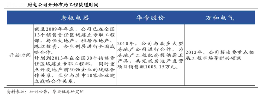 經典案例:根據公司公告、華安證券研究所等綜合資訊表明,早在老板電器2010 年上市前,其已經開始布局工程渠道,根據招股說明書,截至 2009 年底,其已在 13 個銷售區域成立工程部,并與恒大地產、珠江投資等地產商建立合作關系,在工程渠道紅利來臨之前及時搶占“先發優勢”。