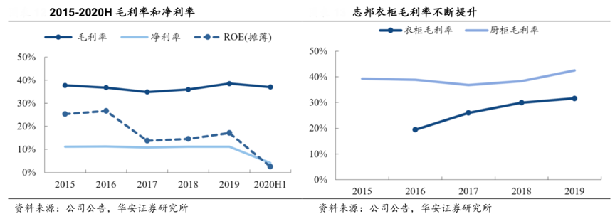 經典案例:根據公司公告、華安證券研究所等綜合資訊表明,受益于大宗客戶結構調整、衣柜業務毛利率的提升以及志邦家居公司對供應鏈的科學管理和精細化生產管理,2019 年志邦的銷售毛利率同比增加了 2.58 個 pct 至38.5%。2015-2019 年公司的凈利率一直保持在 11%左右,而上市后 ROE(攤薄)連續兩年呈上升趨勢。