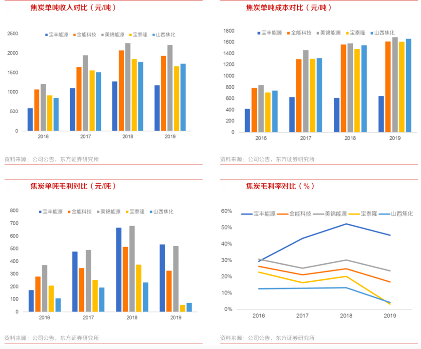 經典案例:根據公司公告、東方證券研究所等綜合資訊表明。寶慧能源公司煤礦所產原煤全部經洗選制精煤后煉焦,受益于自有煤礦配套,其焦炭板塊盈利水平與煤焦一體化企業較為接近,遠高于外購原料的焦炭企業。公司盈利優勢主要來自于成本端,約 50%的精煤來源于自有 煤礦,精煤成本較完全外購低約 170-220 元/噸,按照1.37 的單耗,對應焦炭原料成本節省 230- 300 元/噸。而毛利端公司近三年平均單噸毛利為 559 元/噸,較可比公司平均高 221 元/噸,基本與原料成本節省幅度一致。