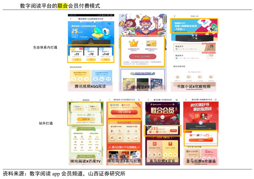 經典案例:根據數字閱讀app會員頻道、山西證券研究所等綜合資訊表明,例如騰訊推出的“騰訊大王卡”,以騰訊體系內超 100 款 app 專屬免流量的模式吸引用戶訂閱,進行資源和用戶流量的整合。除互聯網平臺生態外,數字閱讀平臺也會與站外其他平臺進行打通推出聯合會員的模式,如咪咕閱讀與喜馬拉雅、芒果 TV 以及 掌閱與優酷視頻等,實現跨平臺的相互導流和提高用戶粘性,獲得增量付費。