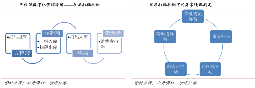 經(jīng)典案例:根據(jù)公開資料、渤海證券等綜合資訊表明,五糧液公司在數(shù)字化營銷模型基本搭建完成以及第八代經(jīng)典五糧液上市之后,其開始采用“控盤分利”營銷模式。首先基于層層掃碼機制,構(gòu)建穩(wěn)定且透明的渠道結(jié)構(gòu),實現(xiàn)對產(chǎn)品流通的透明高效的數(shù)字化跟蹤監(jiān)控以及衡量評估。