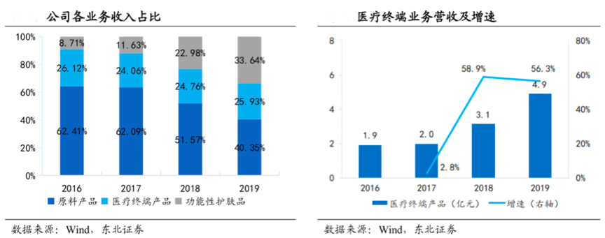 經(jīng)典案例:根據(jù)wind、東北證券等綜合資訊表明,華熙生物分業(yè)務(wù)來看,原料產(chǎn)品占主導(dǎo)地位,功能性護(hù)膚品占比快速提升。2019年原料業(yè)務(wù)營收達(dá) 7.6 億元/+16.8%/占比 40.4%,2016-2019 年?duì)I收 CAGR 為 18.5%,醫(yī)療終端業(yè)務(wù)和功能性護(hù)膚品業(yè)務(wù)高速增長。