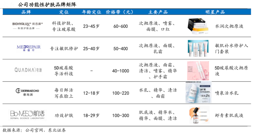 經(jīng)典案例:根據(jù)公司官網(wǎng)、東北證券等綜合資訊表明,華熙生物的功能性護(hù)膚品各品牌均主打功效護(hù)膚,其中潤百顏主打玻尿酸“補(bǔ)水”、“修復(fù)”, 采用核心成分 miniHA 及不同分子量配比技術(shù),明星產(chǎn)品為水潤次拋原液;米蓓爾主打敏肌修護(hù),夸迪主打高端 5D 玻尿酸活導(dǎo)技術(shù);德瑪潤與 BIO-MESO 的明星產(chǎn) 品則分別為噴泉活水乳和蝦青素肌底液。
