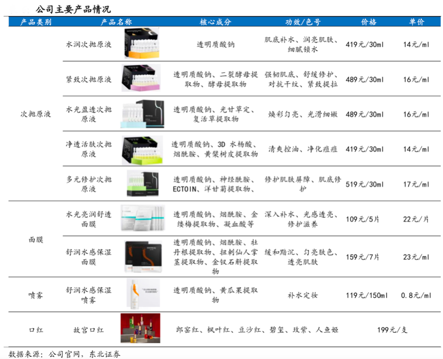 經(jīng)典案例:根據(jù)公司官網(wǎng)、東北證券等綜合資訊表明,華熙生物生產(chǎn)了一系列具有不同功效的無菌、無防腐劑小包裝次拋原液產(chǎn)品,該系列產(chǎn)品辨識(shí)度高且競(jìng)品較少,同時(shí)其還先后開發(fā)出以添加透明質(zhì)酸及衍生物為核心的面膜、噴霧、水乳膏霜等功能性護(hù)膚品。