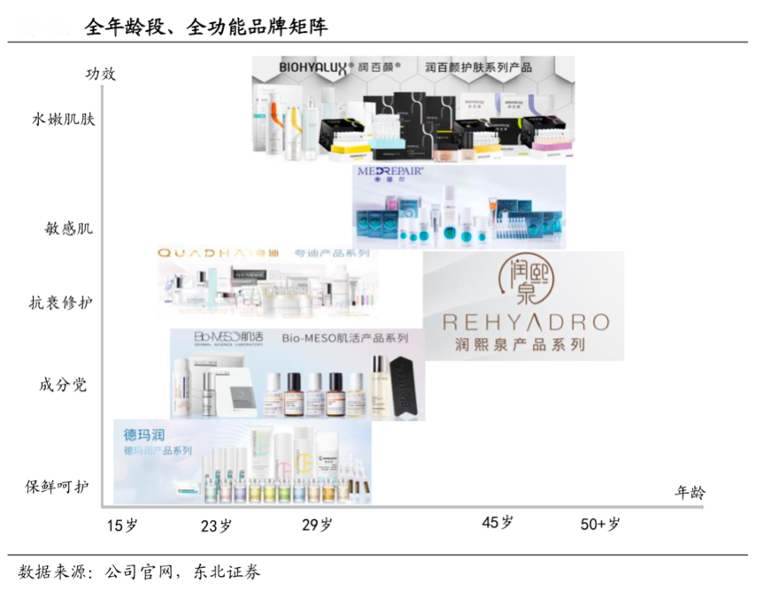 經(jīng)典案例:根據(jù)公司官網(wǎng)、東北證券等綜合資訊表明,2018年華熙生物以多品牌多事業(yè)部打造全年齡段、全功能覆蓋的功 能性護(hù)膚品牌矩陣,在原有“潤(rùn)百顏”品牌基礎(chǔ)上,陸續(xù)推出“BIO-MESO”、“米蓓爾”、“夸迪”、“德瑪潤(rùn)”、“華熙頤寶”等多個(gè)新品牌。新品牌以透明質(zhì)酸及其他生物活性物質(zhì)為核心成分,針對(duì)敏感皮膚、皮膚屏障受損等不同的皮膚問(wèn)題定位精準(zhǔn)人群。
