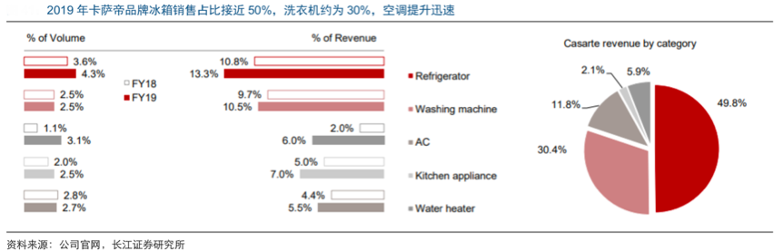 經(jīng)典案例:根據(jù)公司官網(wǎng)、長(zhǎng)江證券等綜合資訊表明,卡薩帝品牌已經(jīng)成為中國(guó)白色家電領(lǐng)域的新標(biāo)桿,分品類(lèi)來(lái)看,2019 年卡薩帝品牌冰箱、洗衣機(jī)、空調(diào)、廚電及熱水器銷(xiāo)售占比分別為 49.8%、30.4%、11.8%、2.1%及5.9%,對(duì)應(yīng)絕對(duì)收入規(guī)模分別為 37 億元、23 億元、 9 億元、2 億元及 4 億元,洗衣機(jī)占比略有下滑,空調(diào)價(jià)格帶下探后規(guī)模增長(zhǎng)迅速。