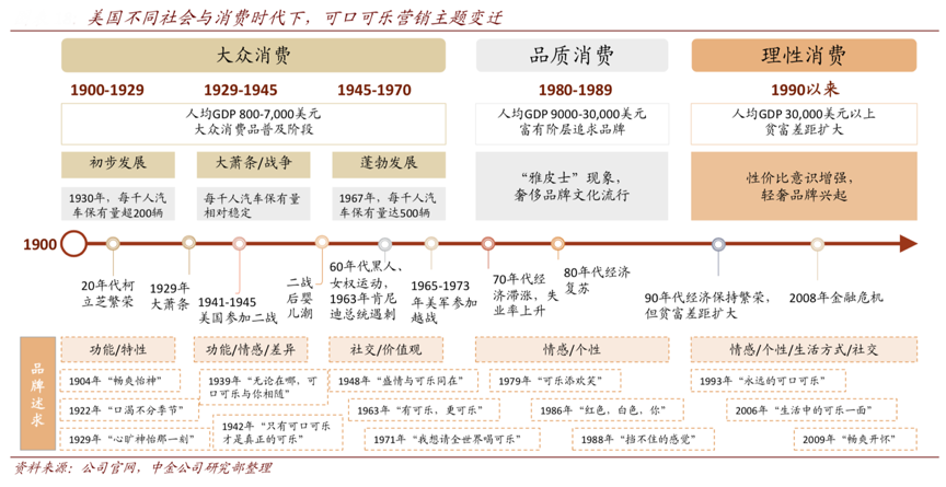 經典案例:根據公司官網、中金公司研究部等綜合資訊表明,1990年以來,美國消費逐漸理性,可口可樂更強調以情感/個性/生活方式/社交等為內在要素傳遞 品牌文化。可口可樂廣告主題的變遷展示了品牌的建立過程,亦展示了美國社會和消費環境的演變過程。