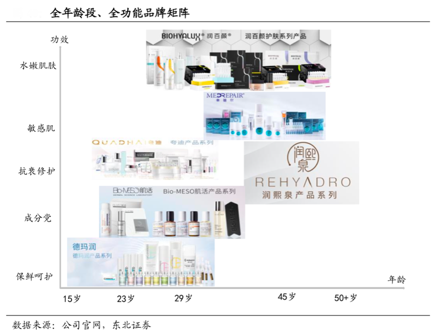 經典案例:根據公司官網、東北證券等綜合資訊表明,華熙生物依托技術優勢,打造多品牌進駐功能性護膚領域。2018 年在原有“潤百顏”品牌基礎上,陸續推出“BIO-MESO”、“米蓓爾”、“夸迪”、“德瑪潤”、“華熙頤寶”等多個新品牌。新品牌以透明質酸及其他生物活性物質為核心成分,針對敏感皮膚、皮膚屏障受損等不同的皮膚問題定位精準人群。功能性護膚品將成為公司未來業績增長的重要驅動力。