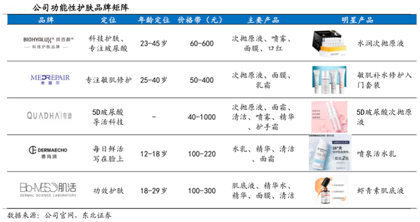 經典案例:根據公司官網、東北證券等綜合資訊表明,華熙生物的功能性護膚品定位不同于傳統的日化類化妝品,更貼近“藥妝”的概念,突出成分和功能細分的差異化定位。潤百顏主打玻尿酸“補水”、“修復”, 采用核心成分 miniHA 及不同分子量配比技術,明星產品為水潤次拋原液;米蓓爾 主打敏肌修護,夸迪主打高端 5D 玻尿酸活導技術;德瑪潤與 BIO-MESO 的明星產品則分別為噴泉活水乳和蝦青素肌底液。