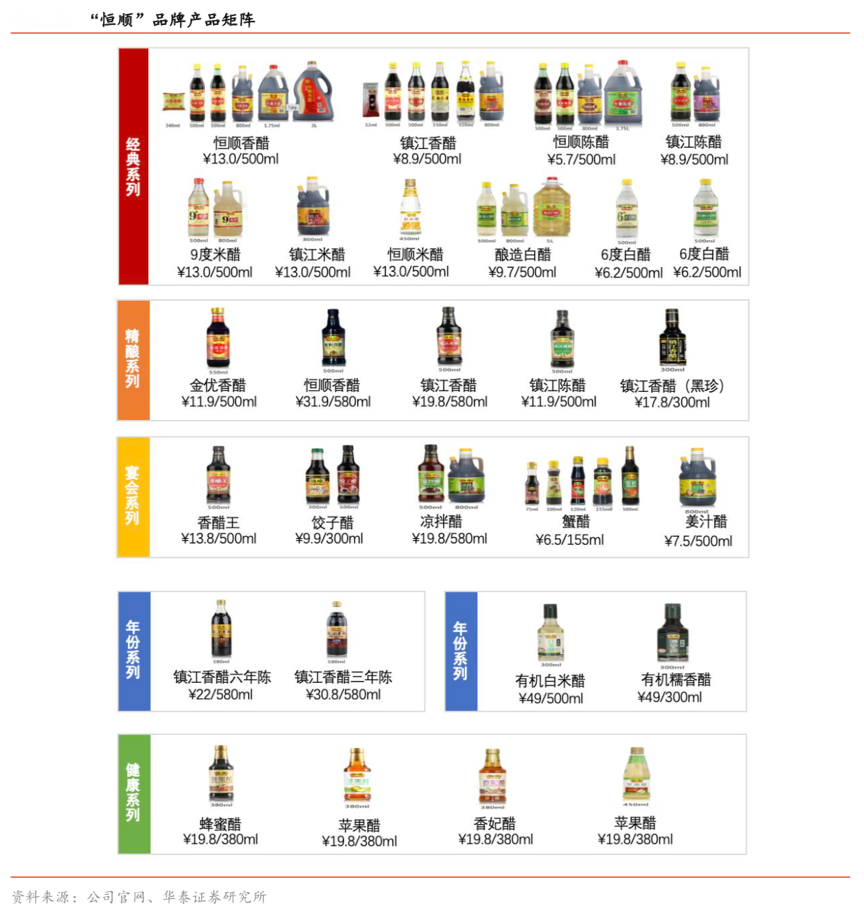 經典案例:根據公司官網、華泰證券研究所等綜合資訊表明,恒順品牌下設有經典系列、精釀系列、宴會系列、年份系列、有機系列、健康系列及禮盒系列等細分系列,價格帶分布集中于 5-30 元/500ml 之間,基本覆蓋醋類主流價格帶。