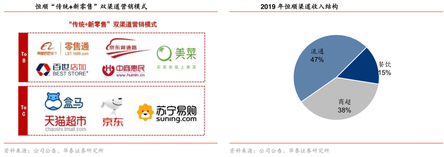 經典案例:根據公司公告、華泰證券研究所等綜合資訊表明,恒順正探索“傳統+新零售”雙渠道營銷模式。從 2B 端來看,恒順與以阿里巴巴零售通、京東新通路、 百世店加、中商惠民惠配通、美菜網為代表的多家電商平臺達成深度合作,積極探索新零售策劃運營等新商業策劃實踐。