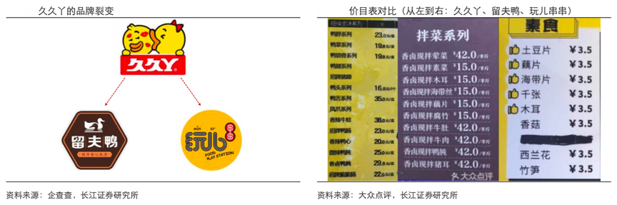 經典案例:根據企查查、大眾點評、長江證券研究所等綜合資訊表明,久久丫創立于 2002 年,產品以鮮貨的鴨副鹵味為主,偏重居家、休閑場景,截止 2018 年 8 月全國開店超 1300 家;2008 年久久丫再次創業,創辦“留夫鴨”品牌,產品除了各類鴨副鹵味,還增加了一些經典的餐桌菜肴(雞鴨肉、豬蹄、煎帶魚、排條、武昌魚等);2011 年,久久丫又創辦了冷鍋串串品牌“玩兒串串”,冷鍋串串產品具有極強的休閑屬性,且單價更低、食用更方便,消費門檻低,更容易勾起消費沖動。