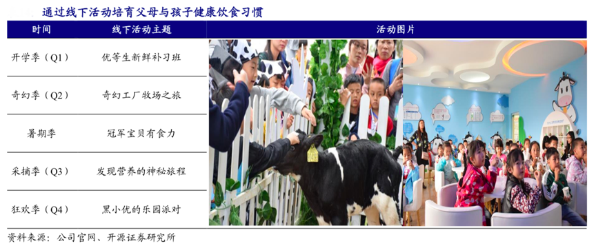 經典案例:根據公司官網、開源證券研究所等綜合資訊表明,新希望乳業持續推動“食育樂園”活動,為孩子們在牧場和牛奶工廠、社區、學校開展實景體驗活動,通過娛樂的方式培育孩子們的健康意識,教會孩子們選擇更營養的食物、養成健康的飲食習慣。線下定期開展的趣味主題活動系列包括“透明工廠游”、“發現營養的神秘旅程”、“黑小優的樂園 PARTY”等,深受小朋友喜愛。