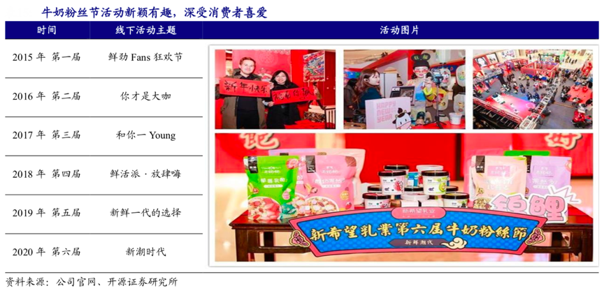 經典案例:根據公司官網、開源證券研究所等綜合資訊表明,新希望乳業持續推進“牛奶粉絲節”活動,消費者可以通過參與線上線下的活動免費享受公司送出的 福利,截至 2019 年粉絲節已連續舉辦六屆。其是首家舉辦大型粉絲節的乳品企業,“粉絲節”如今已成為了公司的年度品牌活動。