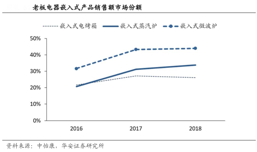 經典案例:根據中怡康、華安證券研究所等綜合資訊表明,老板電器憑借對電商渠道的成熟布局,大力推進嵌入式產品在線上的發展。2018 年其成為天貓嵌入式微蒸烤行業聯盟的首批成員之一,并發布專供天貓的嵌入式蒸箱新品 S273X,2018 年嵌入式電烤箱、蒸汽爐、微波爐銷售額份額分別達 26.1%、33.8%、44.1%,其中蒸汽爐和微波爐位列行業第一。