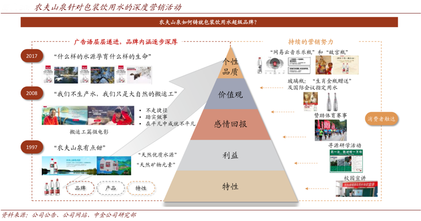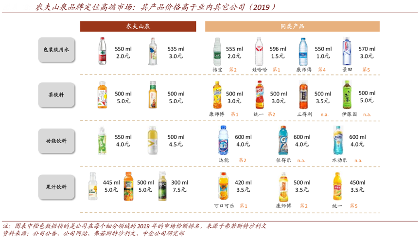 經(jīng)典案例:根據(jù)公司公告、弗若斯特沙利文、中金公司研究部等綜合資訊表明,農(nóng)夫山泉的產(chǎn)品定價相對更高,彰顯其更優(yōu)的產(chǎn)品質(zhì)量和更強(qiáng)的品牌實(shí)力,消費(fèi)者對健康、無添加、個性化及高端產(chǎn)品認(rèn)可度比較高;同時農(nóng)夫山泉“高端化的產(chǎn)品結(jié)構(gòu)”更符合中國軟飲料行業(yè)整體的高端化發(fā)展趨勢。