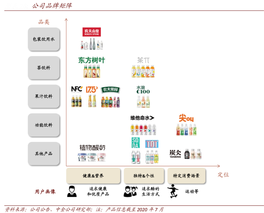 經(jīng)典案例:根據(jù)公司公告、中金公司研究部等綜合資訊表明,農(nóng)夫山泉在目前覆蓋的每個細(xì)分領(lǐng)域均有 1-2 個獨(dú)立品牌,其品牌下屬品牌可分為三大類:“健康與營養(yǎng)”、“獨(dú)特&個性”和“特定消費(fèi)場景”,核心品牌資產(chǎn)持續(xù)累積。