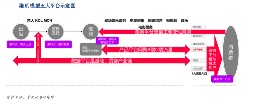 經(jīng)典案例:根據(jù)東興證券研究所等綜合資訊表明,產(chǎn)品平臺(tái)是“貓眼娛樂(lè)”之貓爪模型戰(zhàn)略落地執(zhí)行的關(guān)鍵。五大平臺(tái)的戰(zhàn)略地位各司其職,資金平臺(tái)通過(guò)投資的手段支持內(nèi)容布局,數(shù)據(jù)平臺(tái)作為核心賦能全產(chǎn)業(yè)鏈,營(yíng)銷平臺(tái)在初期輔助傳 播,后期觸達(dá)用戶成為商業(yè)化 變現(xiàn)工具,票務(wù)平臺(tái)作為最主要的業(yè)務(wù)模式串聯(lián)院線資源,反哺內(nèi)容的創(chuàng)作,同而產(chǎn)品平臺(tái)則是數(shù)據(jù),流量及業(yè)務(wù)產(chǎn)生和流轉(zhuǎn)的基礎(chǔ),對(duì)于貓眼的商業(yè)模式是中流砥柱的作用。