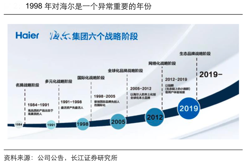 經(jīng)典案例:根據(jù)公司公告、長(zhǎng)江證券研究所等綜合資訊表明,1998 年,海爾品牌走上了“國(guó)際化之路”,對(duì)內(nèi)進(jìn)行“業(yè)務(wù)流程再造”,矩陣式組織及扁平化渠道的治理和業(yè)務(wù)模式便始于此;對(duì)外海爾也開(kāi)始推進(jìn)其國(guó)際化戰(zhàn)略。一段國(guó)際化征程正式開(kāi)啟。