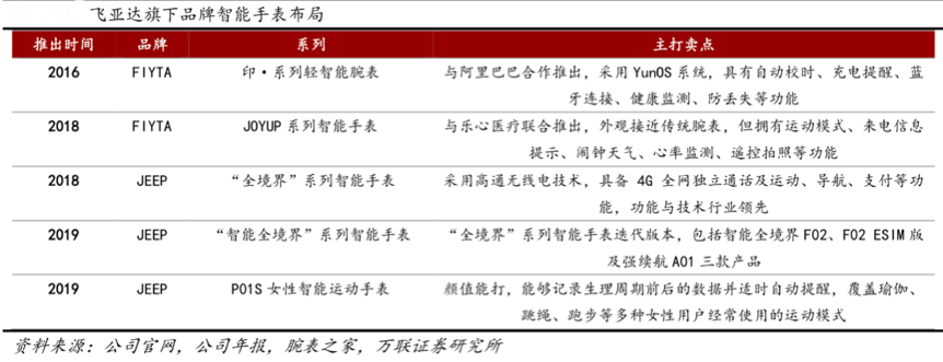 經(jīng)典案例:根據(jù)公司官網(wǎng)、公司年報(bào)、腕表之家、萬聯(lián)證券研究所等綜合資訊表明,2016年起其通過“FIYTA”與“JEEP”品牌布局智能手表領(lǐng)域,其先后聯(lián)合阿里巴巴與樂心醫(yī)療推出印·系列輕智能腕表、有氧能力“JOYUP”系列、主打獨(dú) 立通話、智能互聯(lián)功能“全境界”系列以及女性健康管理“P01S”智能手表,2019年 ESIM版“智能全境界”智能手表新品為中國(guó)聯(lián)通官方首批認(rèn)證的智能手表,在智能手表通訊領(lǐng)域技術(shù)領(lǐng)先。