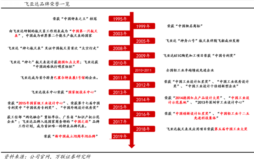 經(jīng)典案例:根據(jù)公司官網(wǎng)、萬聯(lián)證券研究所等綜合資訊表明,“飛亞達(dá)”是國(guó)內(nèi)手表領(lǐng)軍品牌、世界三大航天表品牌之一,2011年作為首個(gè)源于中國(guó)的國(guó)際腕表品牌進(jìn)駐瑞士巴塞爾鐘表展1號(hào)館,并連續(xù)9年參展;2019年,作為腕表行業(yè)唯一一家代表品牌,飛亞達(dá)榮登“新中國(guó)成立70周年70品牌”榜單。